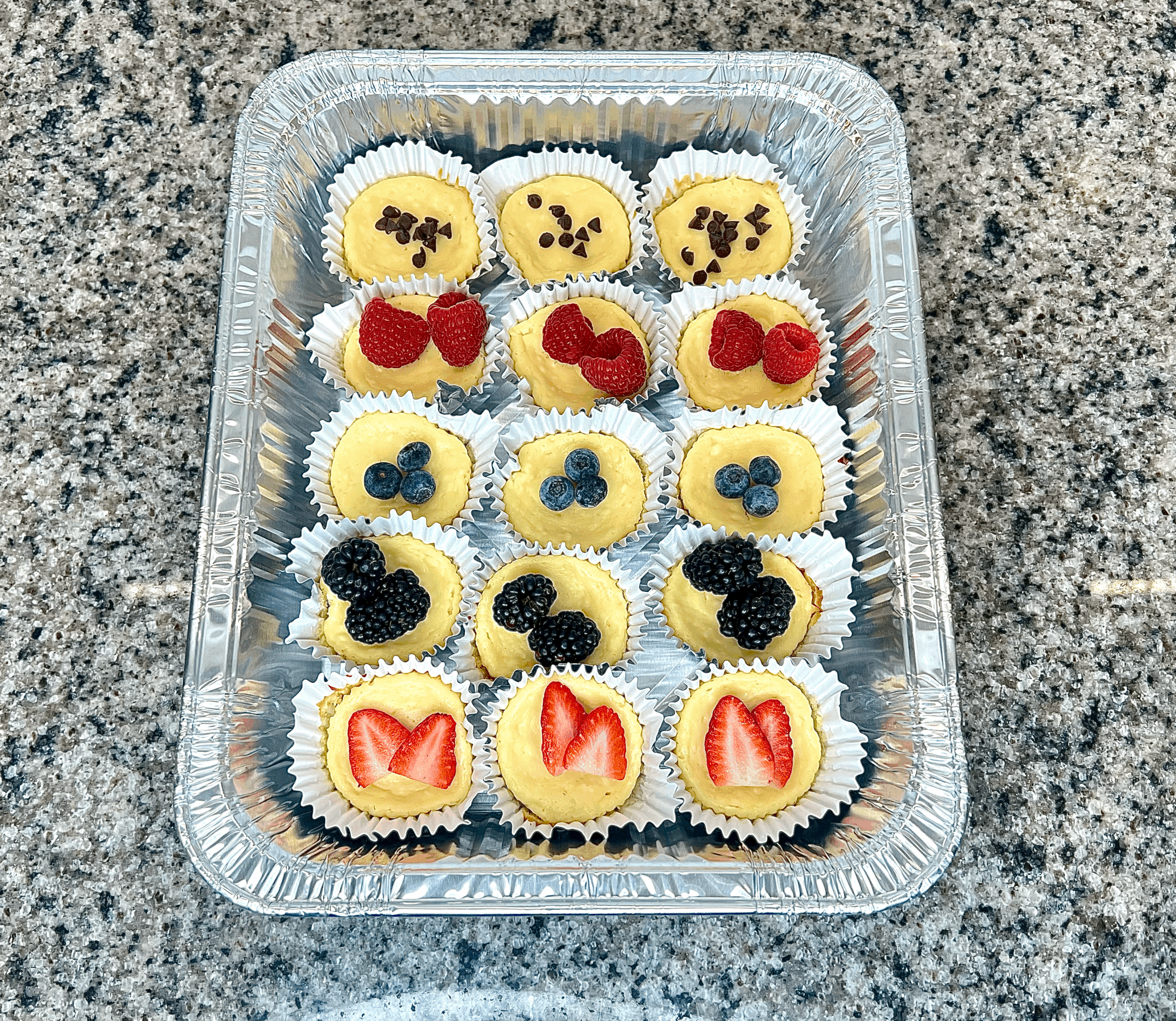 15 homemade mini New York style cheesecakes; 3 topped with mini chocolate chips, 3 topped with fresh strawberries, 3 topped with fresh blackberries, 3 topped with fresh raspberries, and 3 topped with fresh blueberries